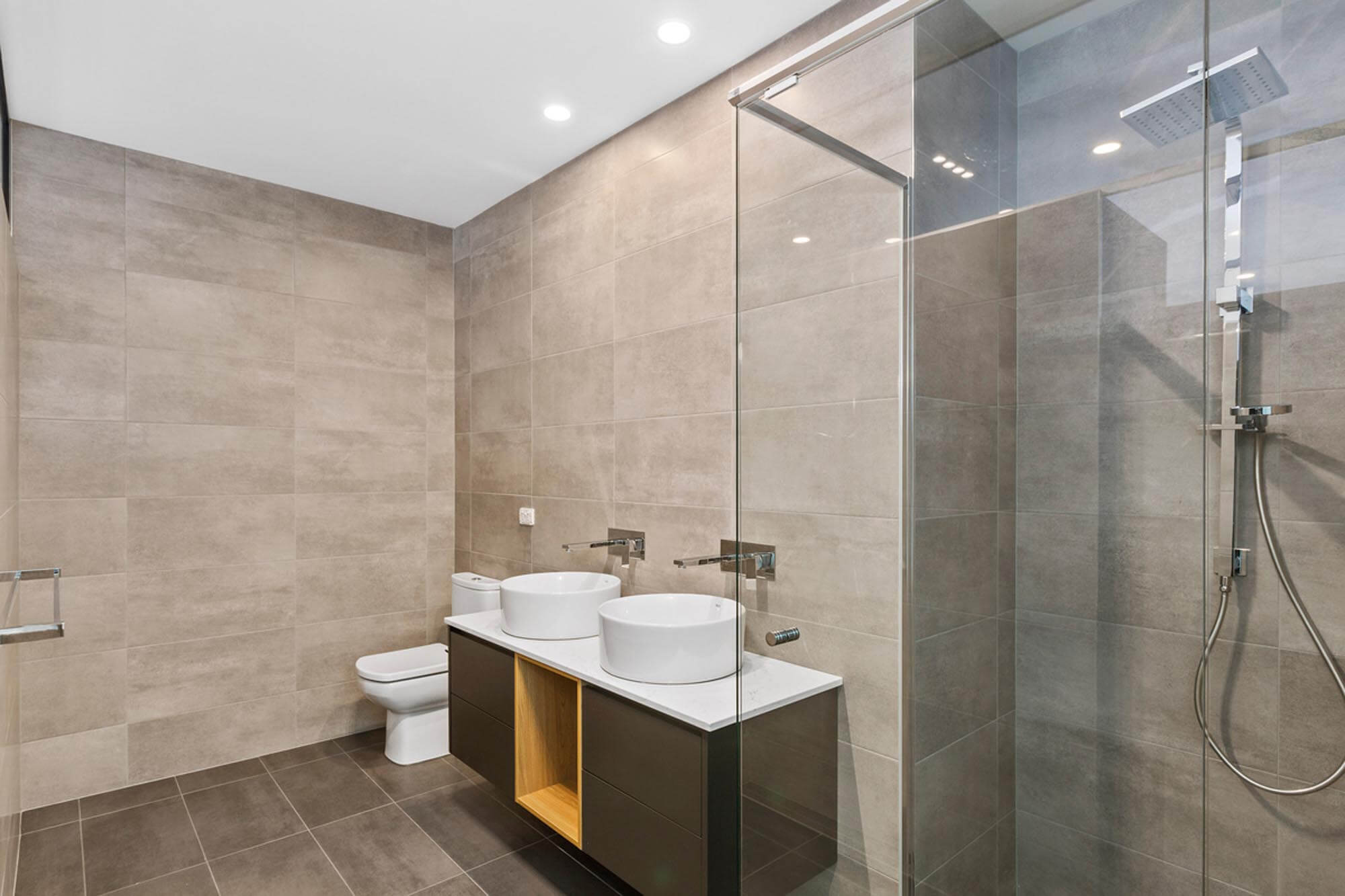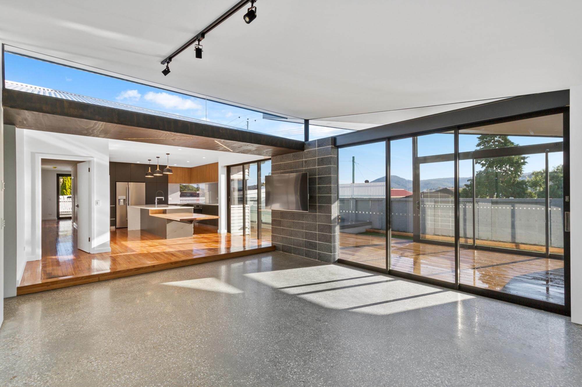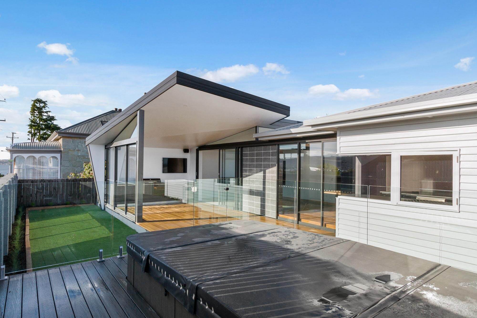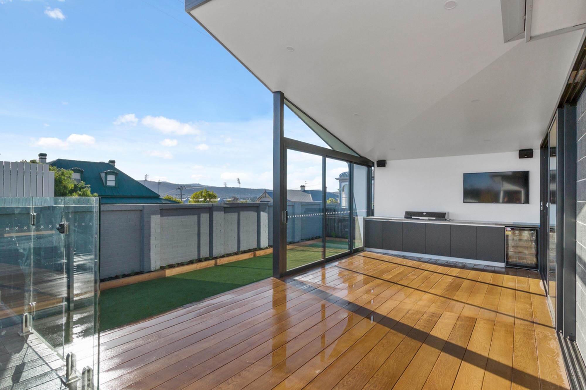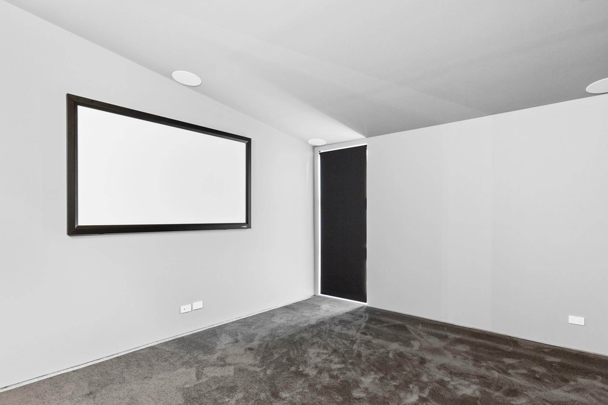 Large sliding glass doors between the adjoining living area and the sweeping deck create flexibility. The deck features an outdoor kitchen and is flanked by a sunken swim spa surrounded by a glass balustrade. A servery window to the kitchen strengthens the link. A separate dedicated sound proof media room with surround sound further enhances the functionality of the extension.