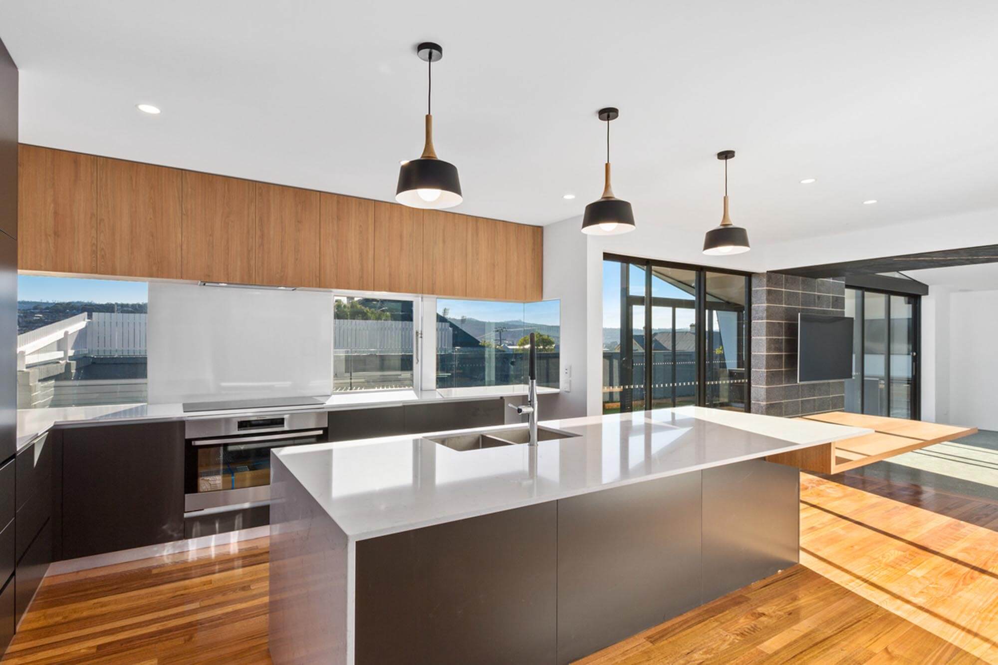An addition to the rear of the house is highlighted by a striking cantilever roof which with generous glazing provides an avenue for natural light into the living areas. The open plan kitchen and living areas are a focus for family activities and entertaining. The impressive state of the art kitchen merges into the dining area. The kitchen is perfect for entertaining with expansive space each side of the island bench. The bench has a unique cantilevered solid oak dining table extending into the living area. It is supported by a large I beam encased through the whole island bench. Concealed posts secure this to concrete piers.