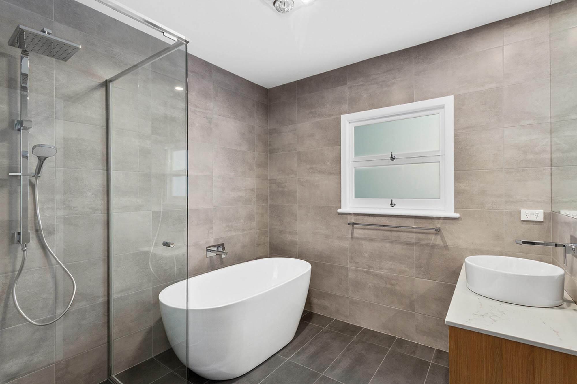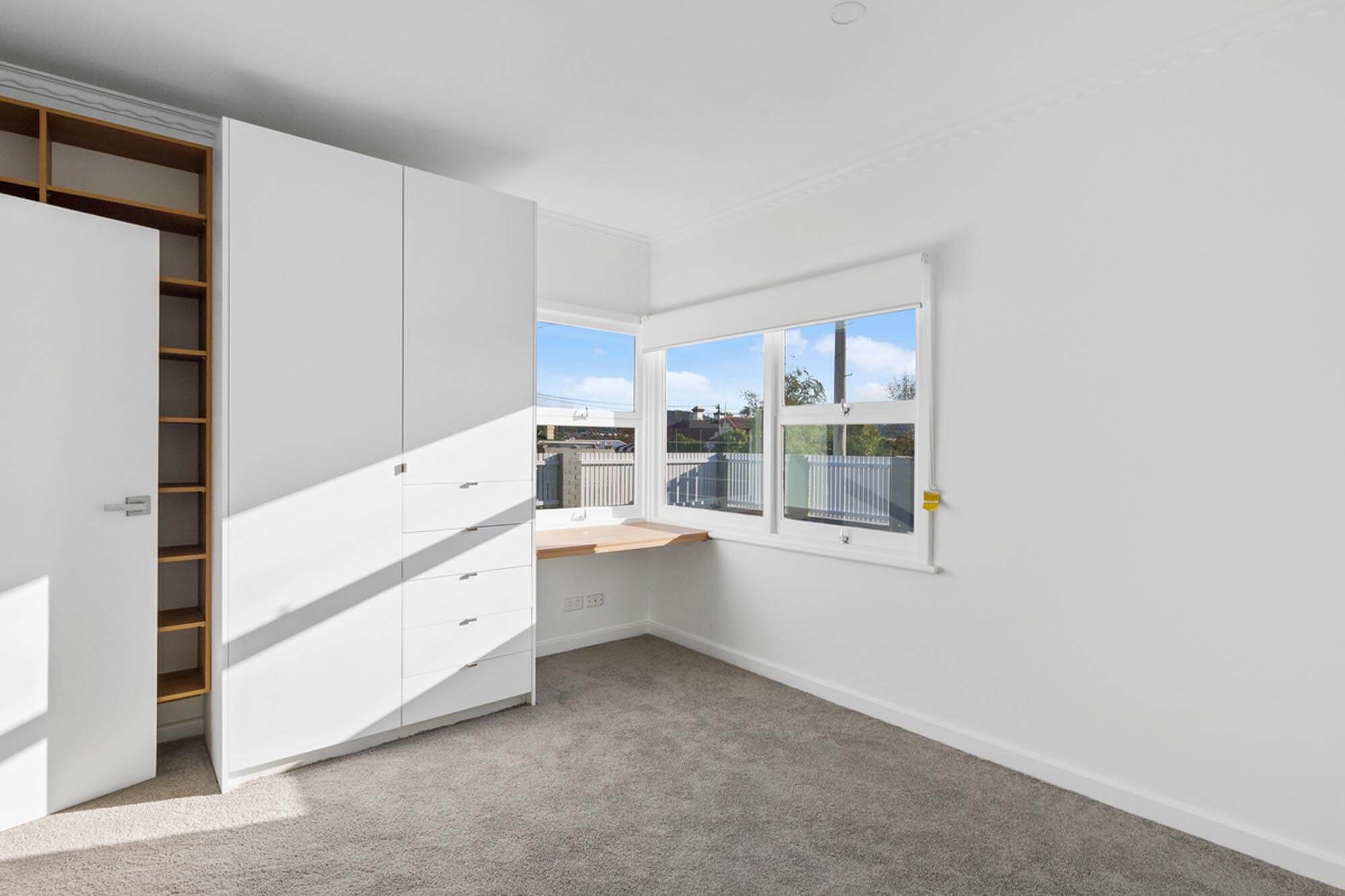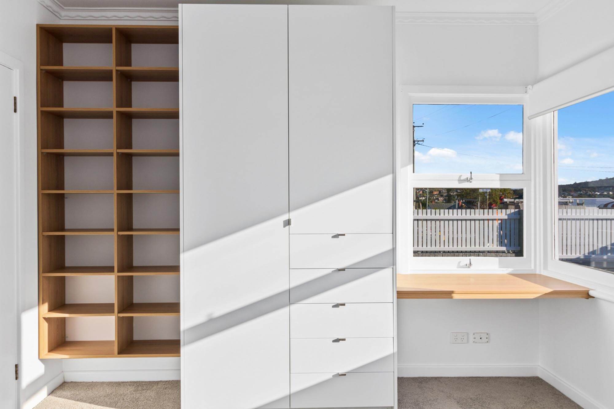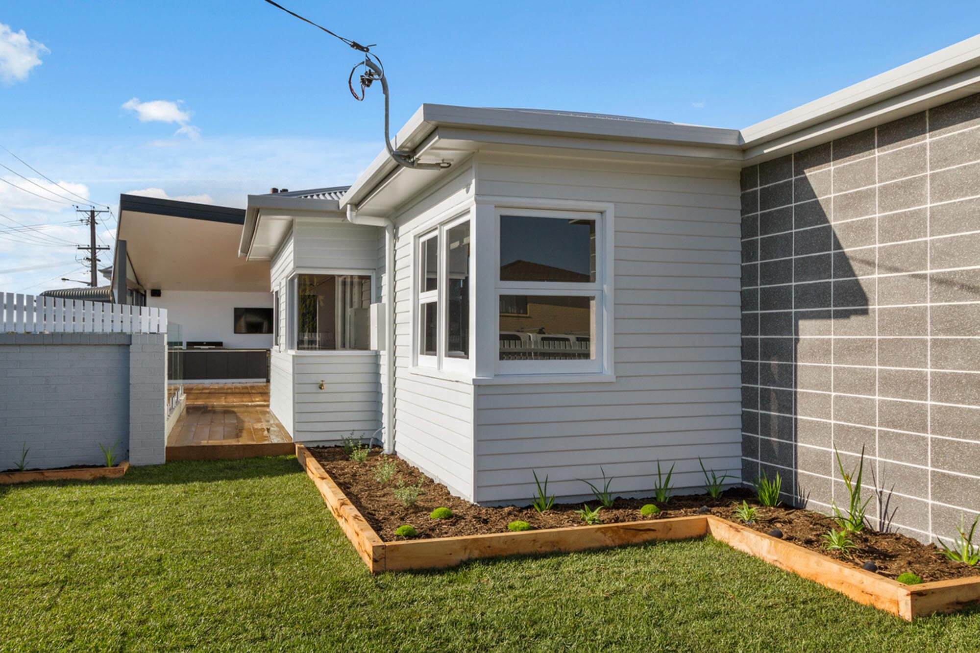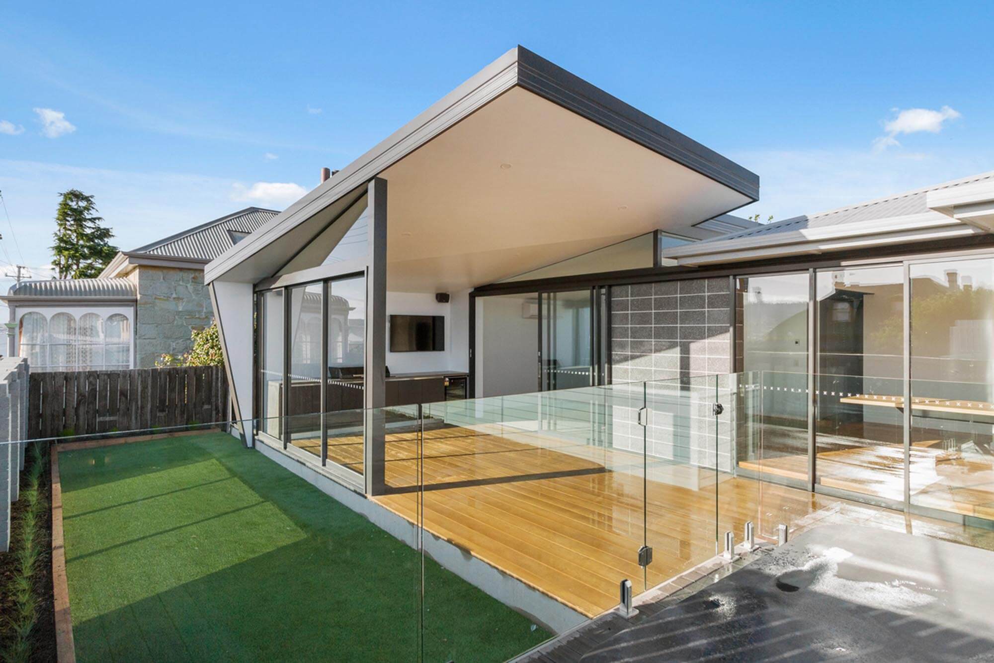 To achieve the renovation the old kitchen and bathroom walls at the rear of the house were removed to open the living areas. The master bedroom at the front expanded into another bedroom to create a walk through robe and an ensuite bathroom. As under the innovative roof use of glass ensures natural light reaches into these spaces. All internal walls were stripped of plaster, insulated and re-plastered. The original timber windows were restored and re-glazed with tinted Low-e glass. The external 1960’s weatherboards were stripped back to raw timber and repainted.