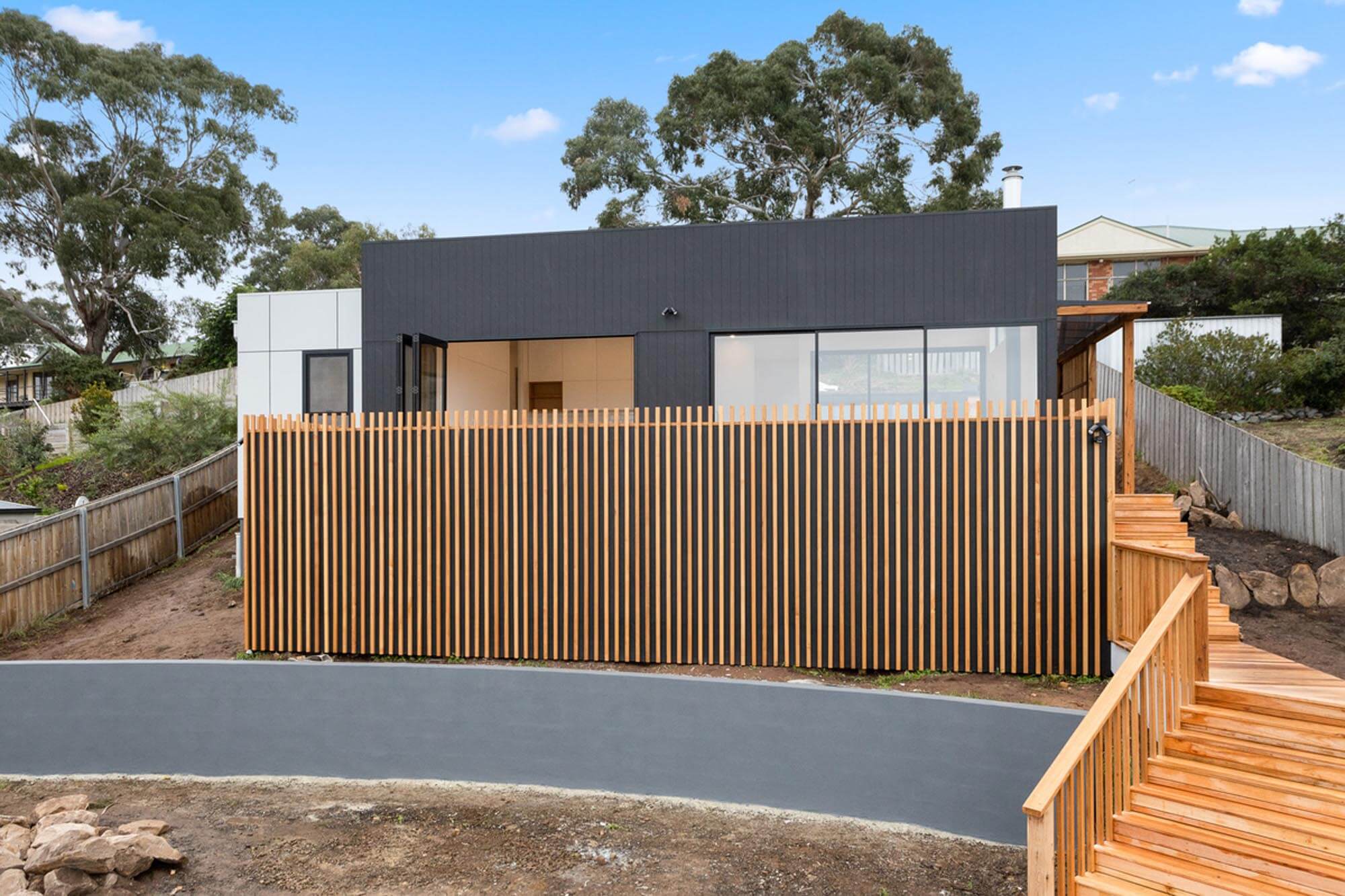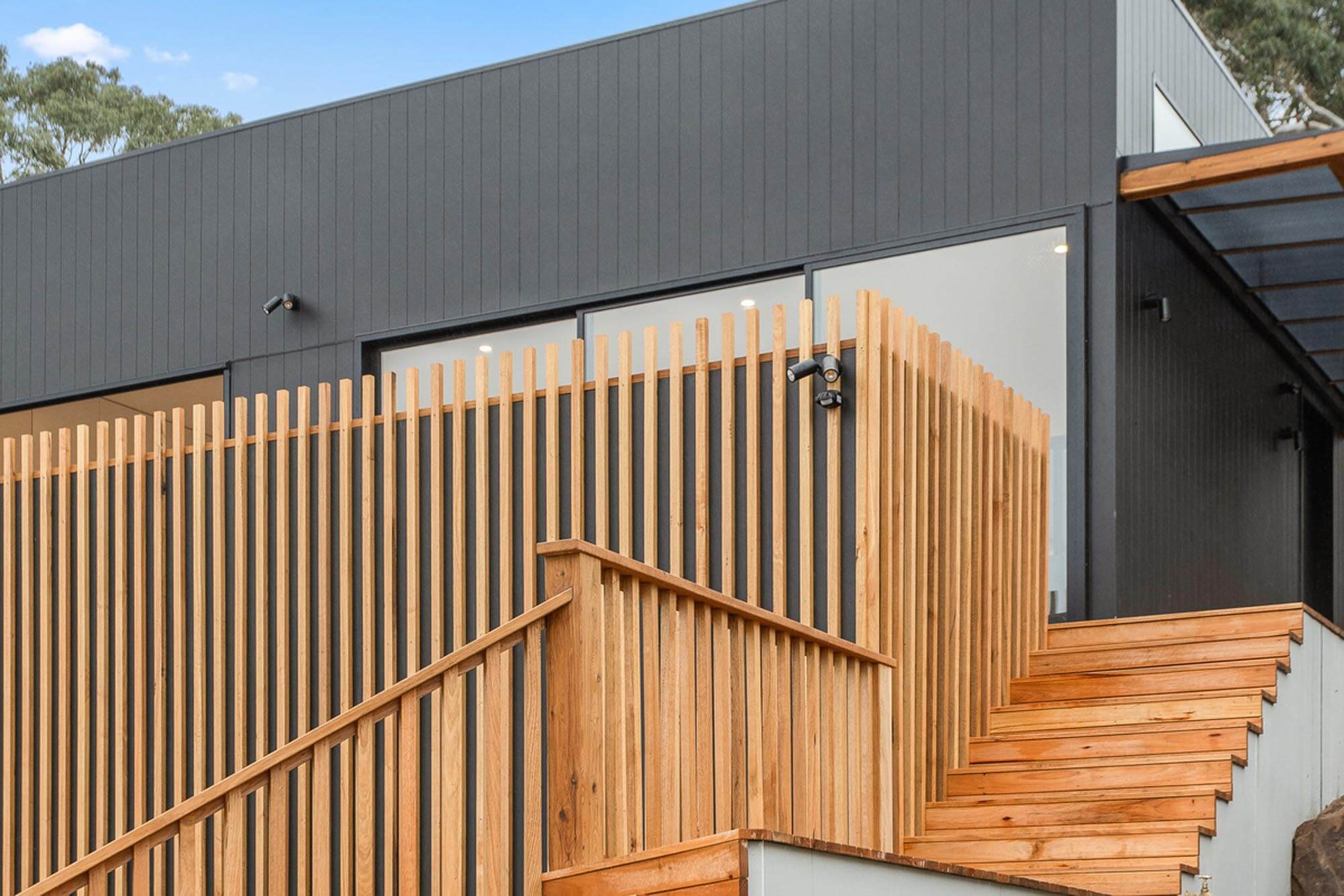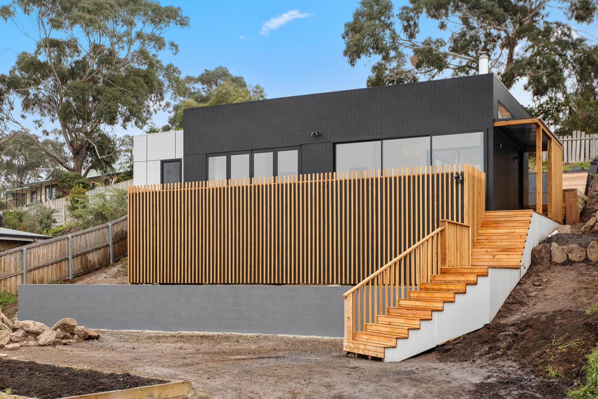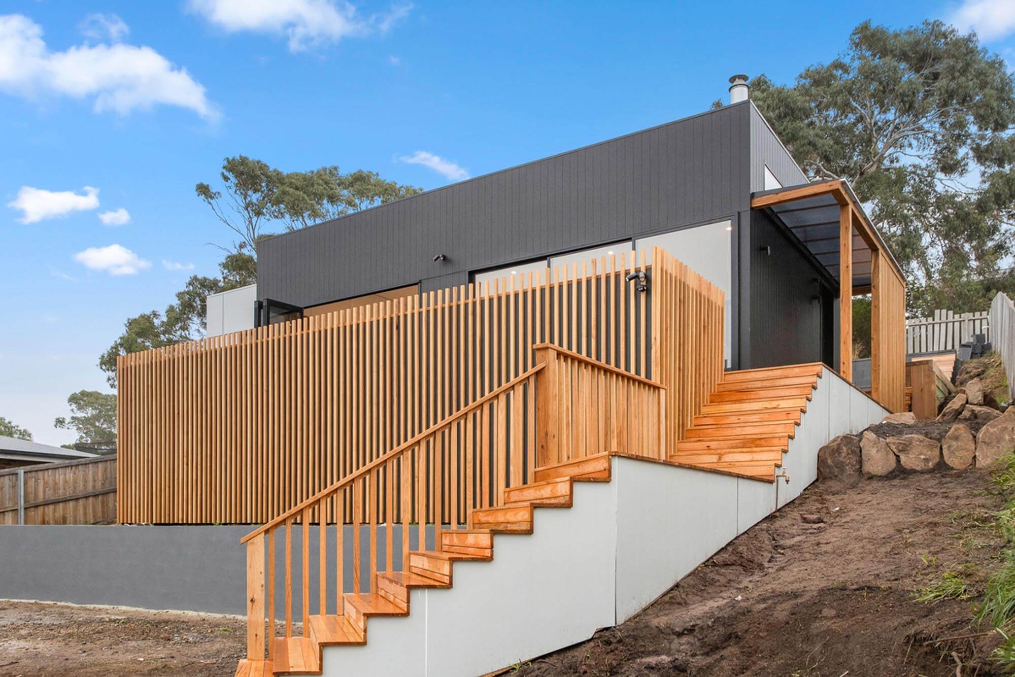 The external character and appeal of the house is derived from a mix of fibre cement sheet painted black and Yellow Gum to complement the earthy tones of the surrounding environment.
