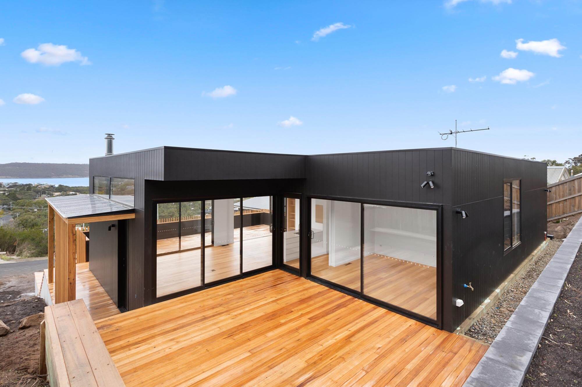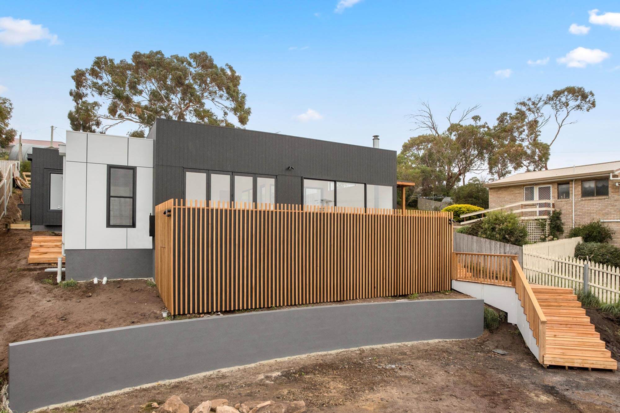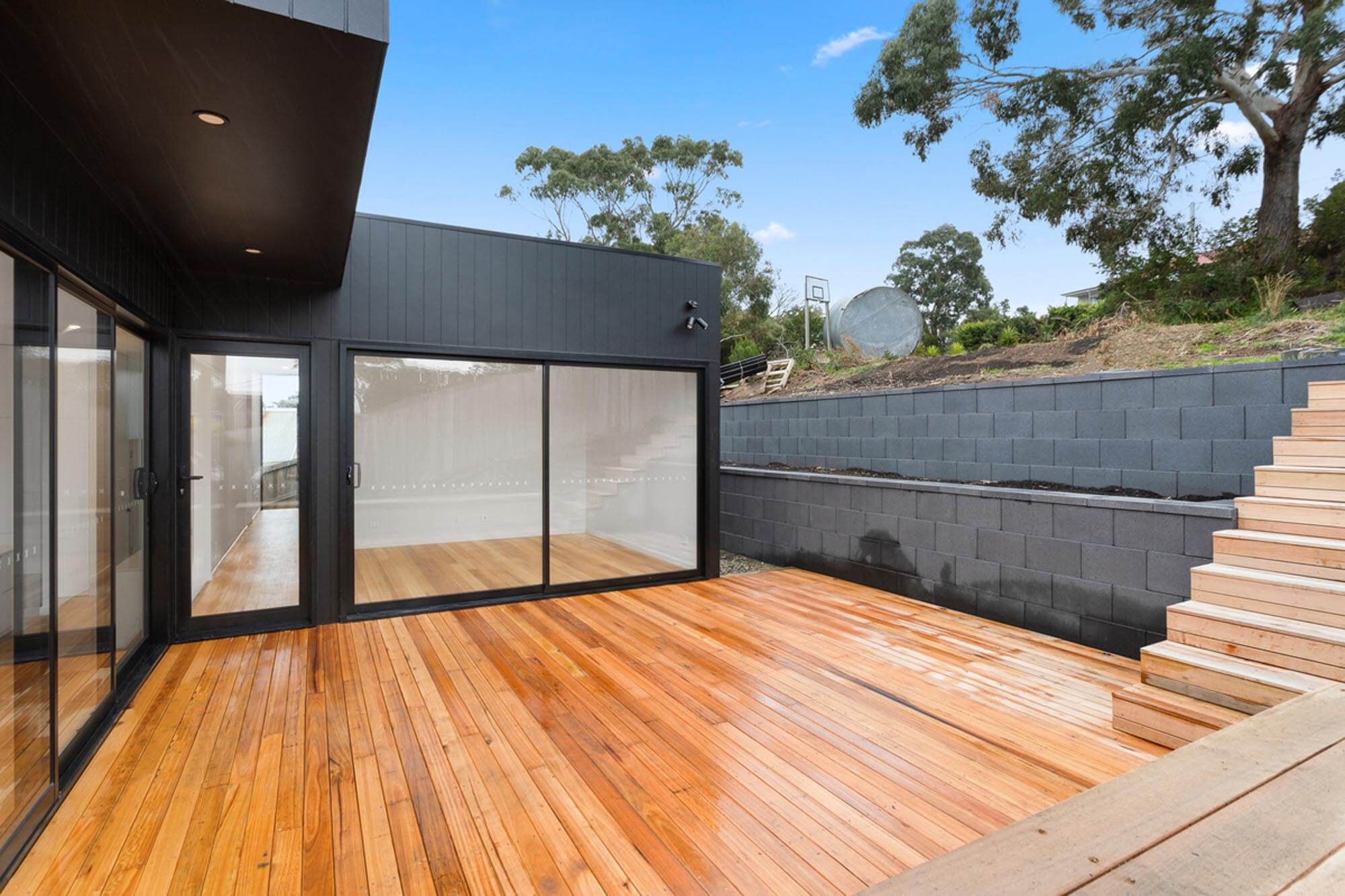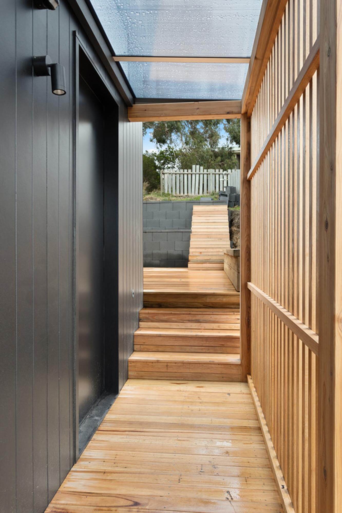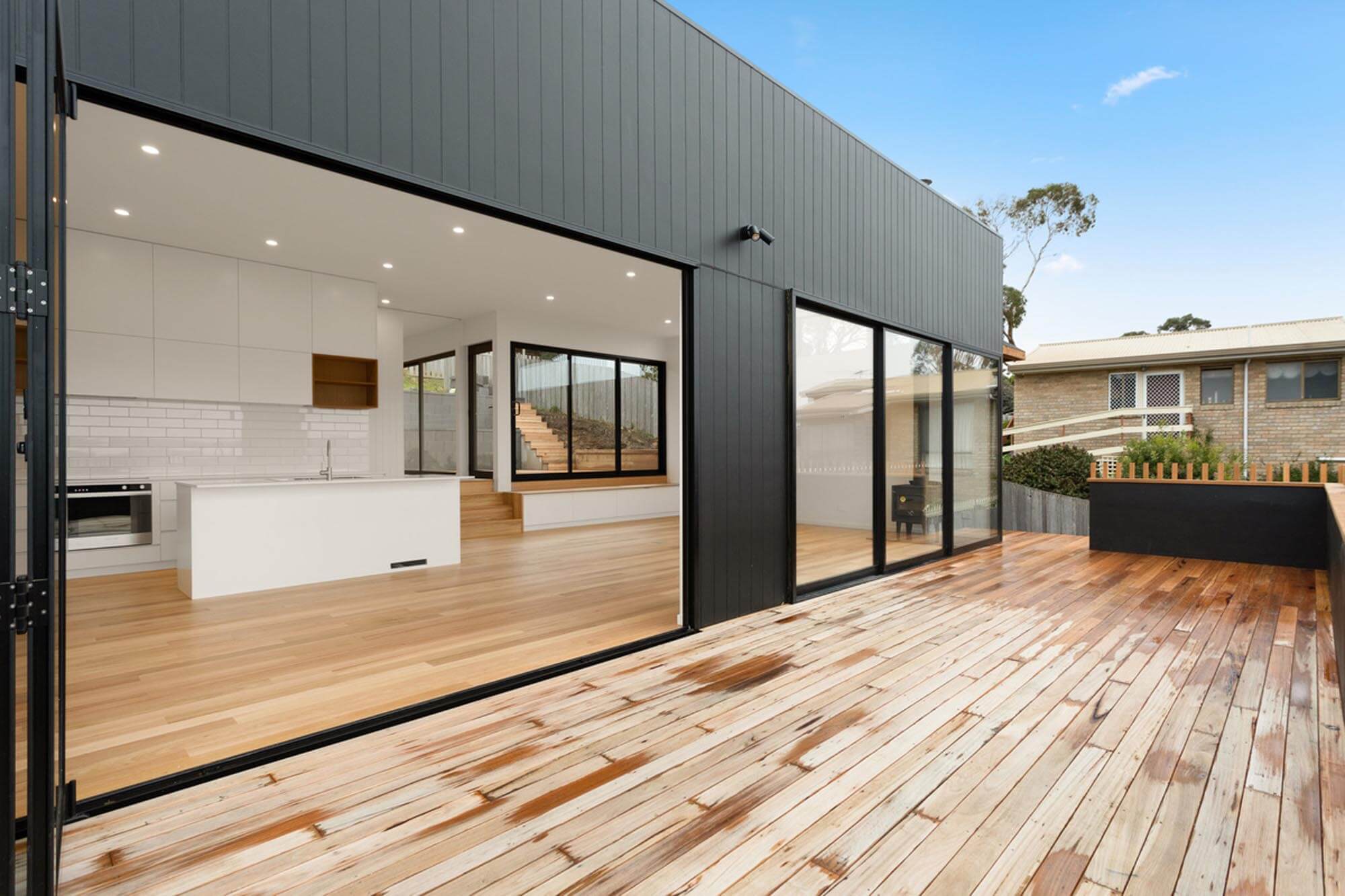 The external character and appeal of the house is derived from a mix of fibre cement sheet painted black and Yellow Gum to complement the earthy tones of the surrounding environment.