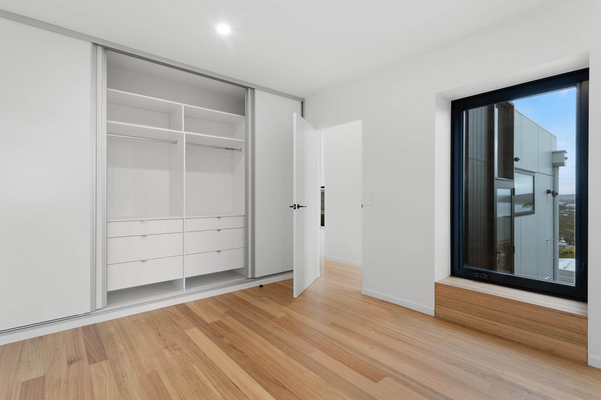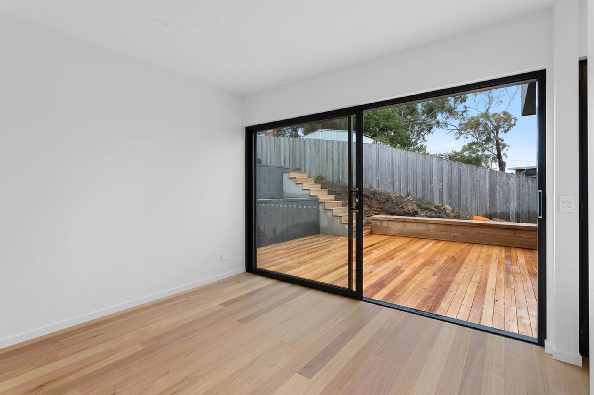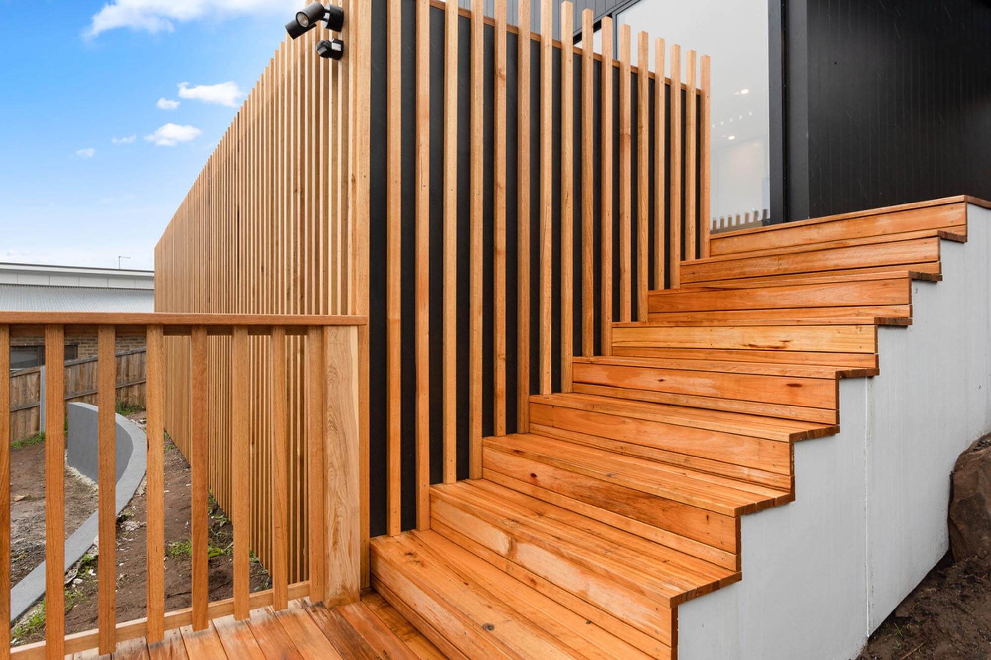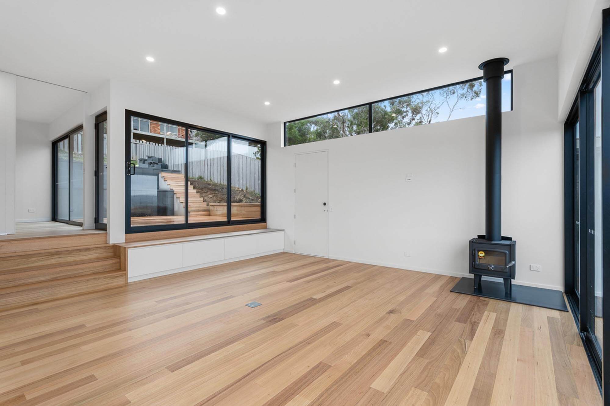 The external character and appeal of the house is derived from a mix of fibre cement sheet painted black and Yellow Gum to complement the earthy tones of the surrounding environment.