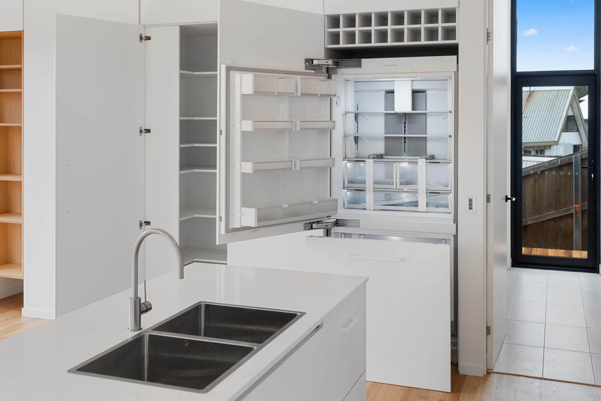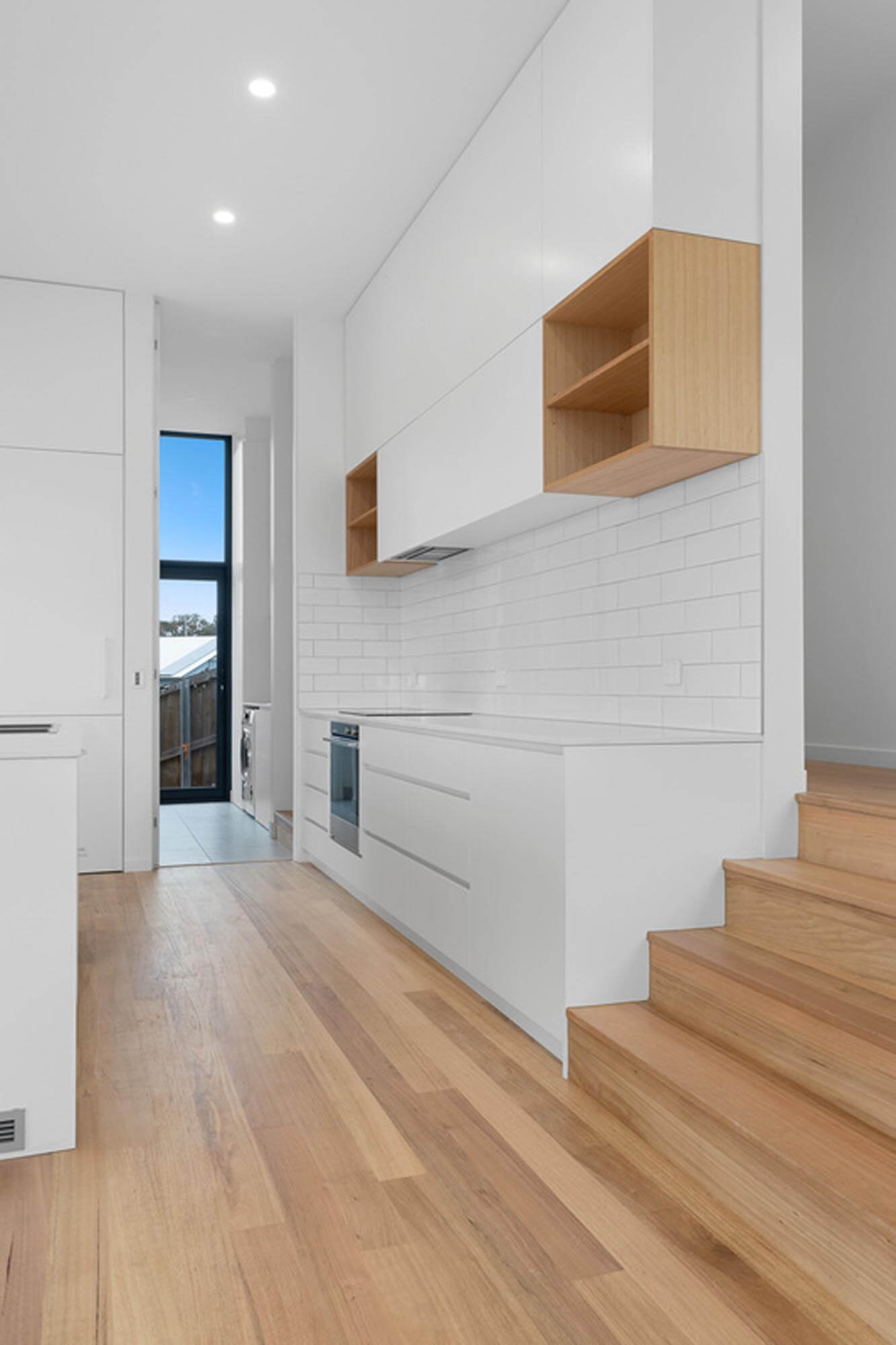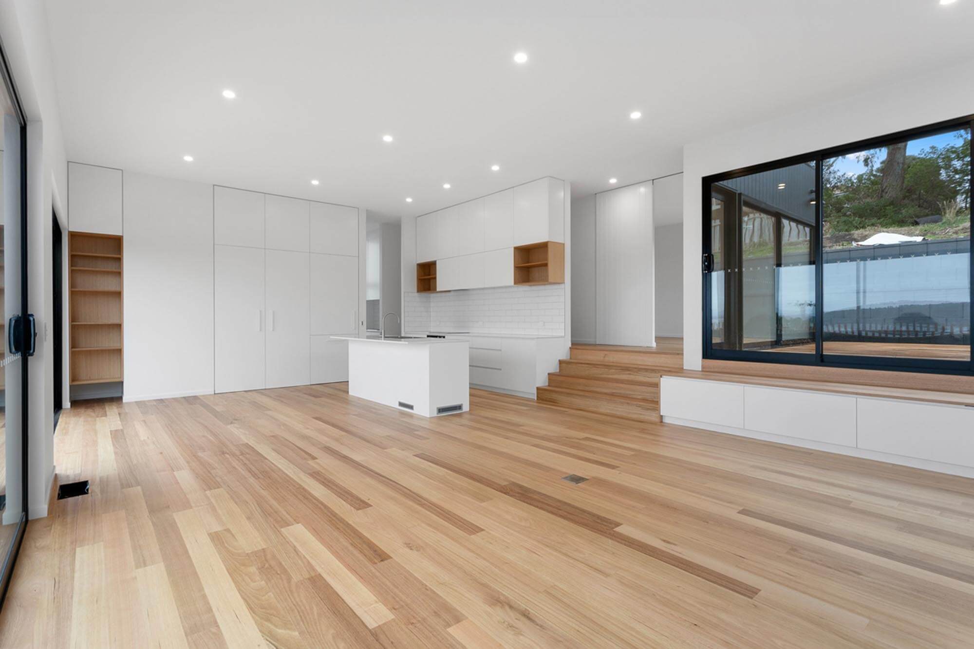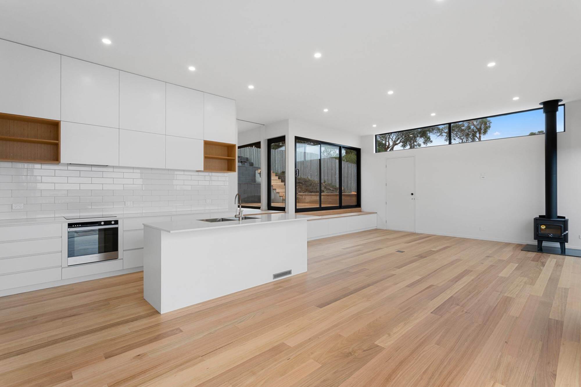 This innovative use of glass facilitates the blending of indoor and outdoor areas. In both levels there is a feeling of spaciousness not usually found in a house with a floor area of only 111 square metres. The large open plan kitchen and dining living spaces open to both the east and west decks. The owners are able to adapt living and entertaining to suit the weather conditions.