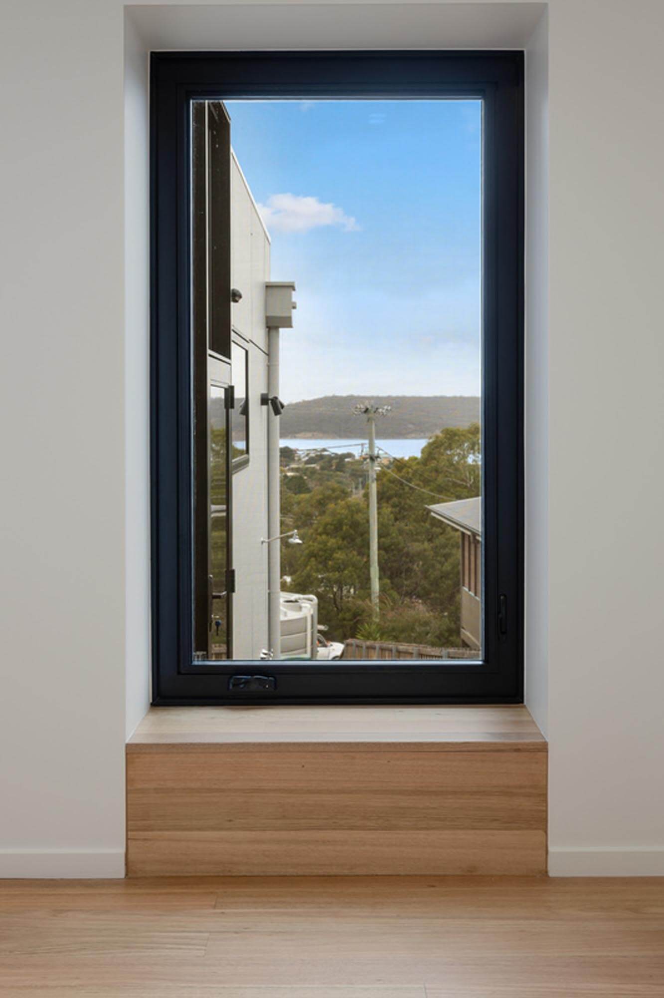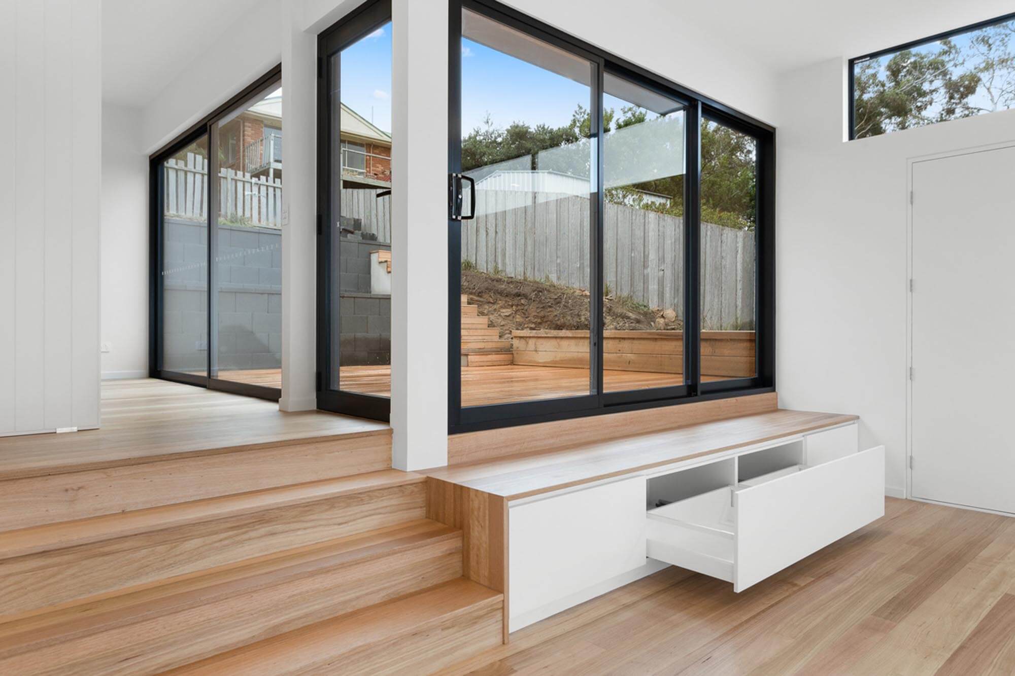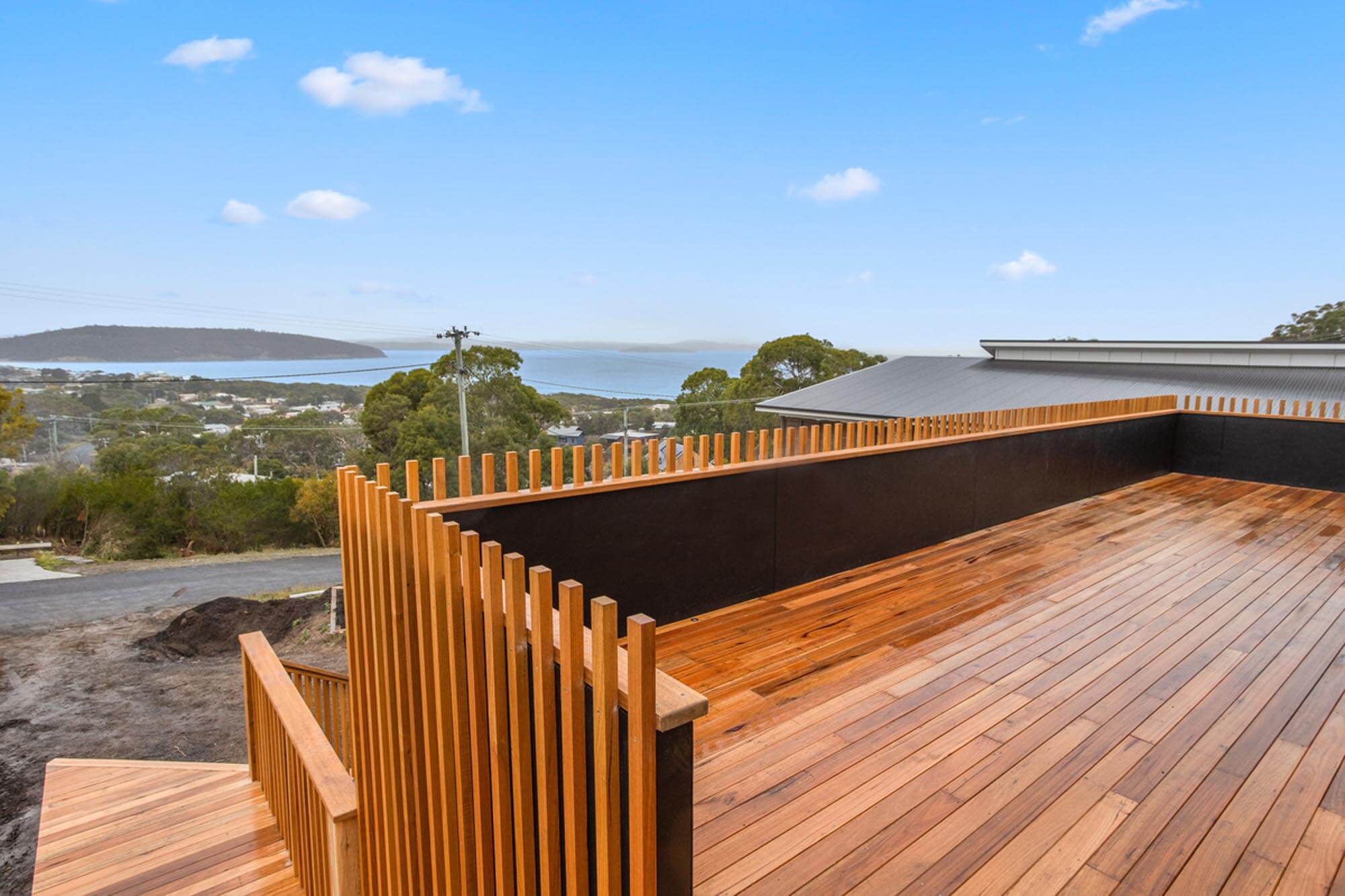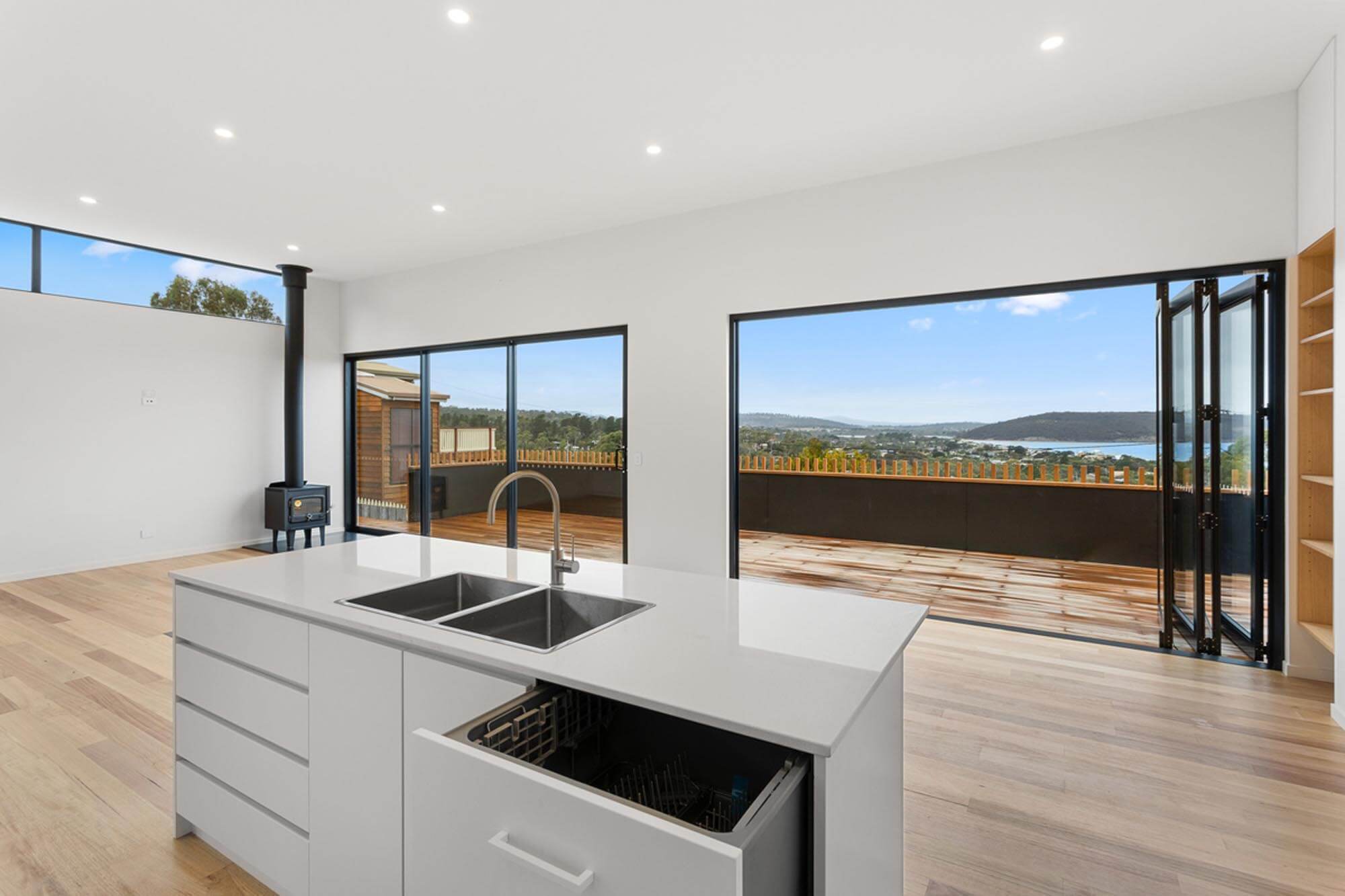 This split-level home was built on a steep block in Dodges Ferry to maximise views over Frederick Henry Bay. The architect who designed the house made expansive use of glass on the front walls enabling the stunning outlook to be enjoyed throughout the home and outdoor living spaces.