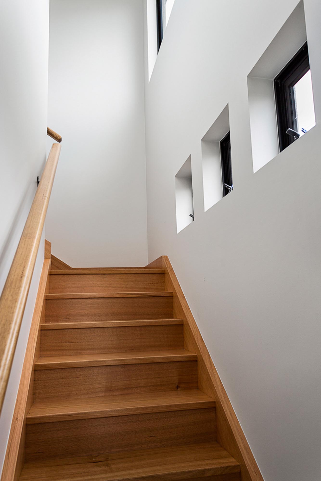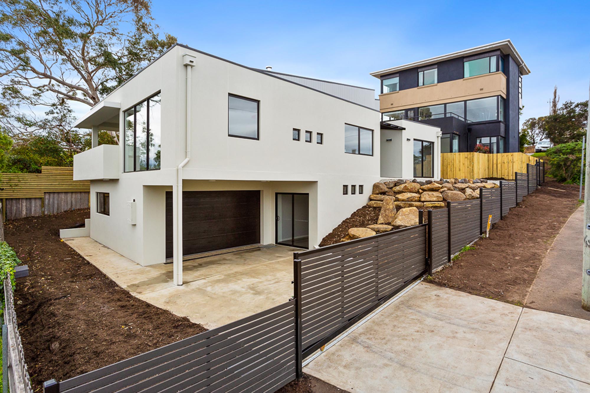 On a sloping block the house sits on a concrete slab at ground level creating garage and storage areas with a suspended slab above for the living areas, deck and bedrooms. The project utilised Hebel panel and render to maximise sound insulation due to proximity to the highway.